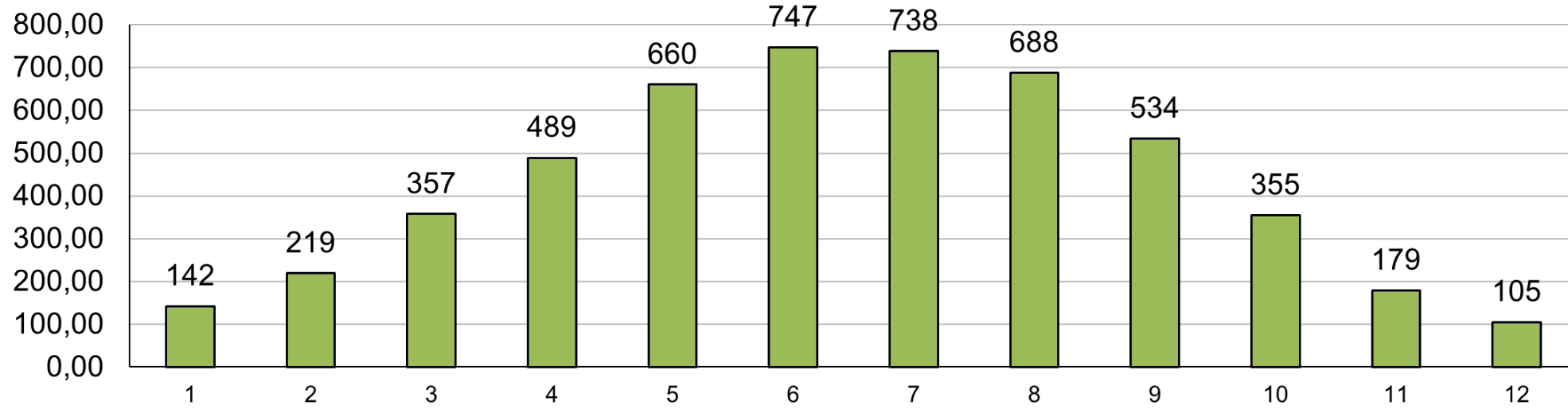 - Минимальная выработка летом — 22,18 кВт в сутки